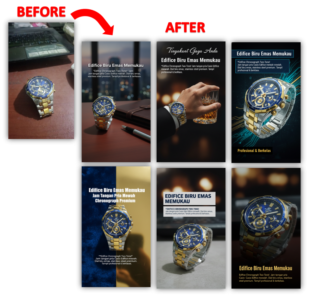Bagaimana kalau kamu bisa ubah foto seadanya jadi visual kelas brand besar — tanpa fotografer, tanpa desain rumit, tanpa mahal.